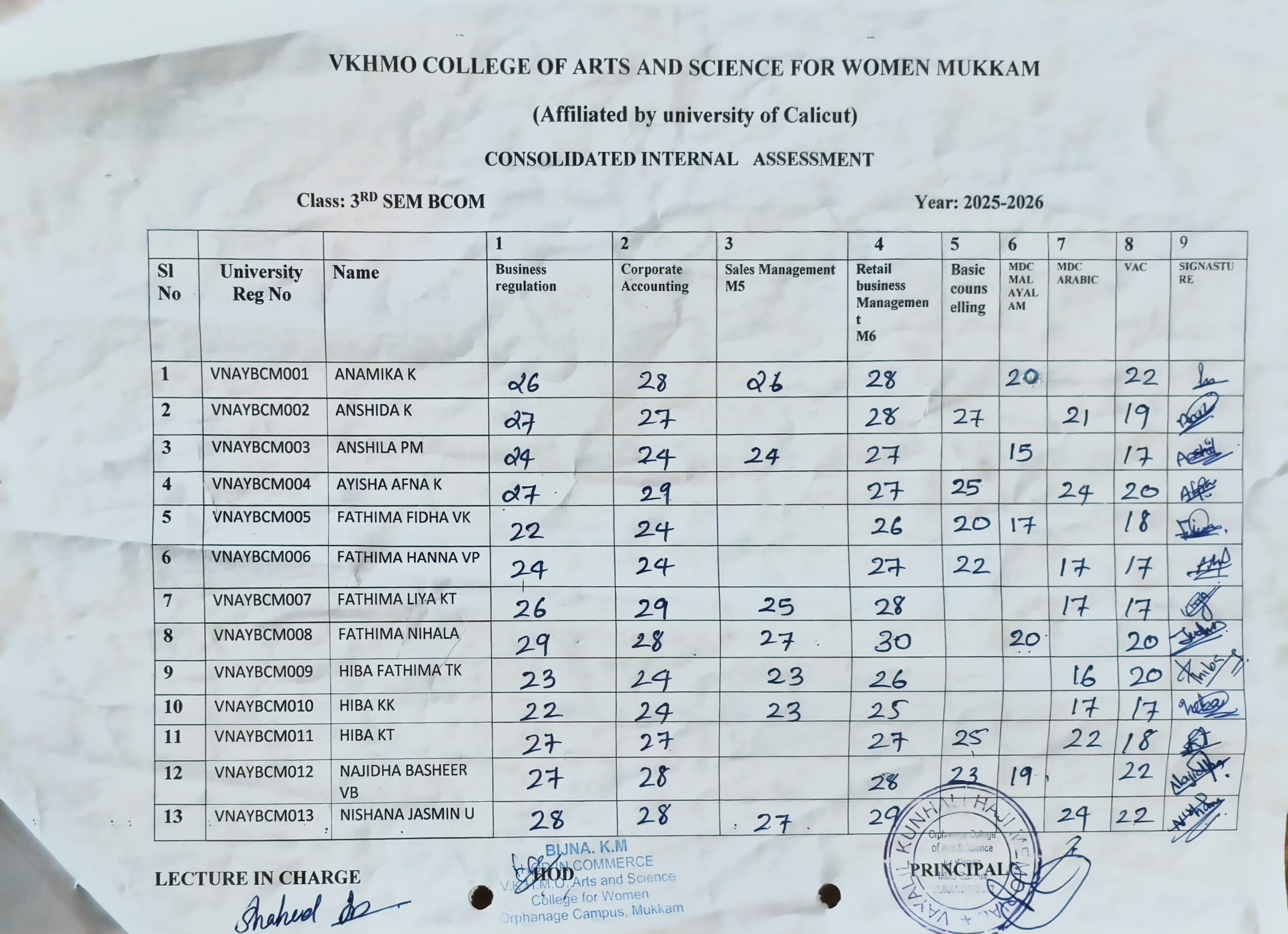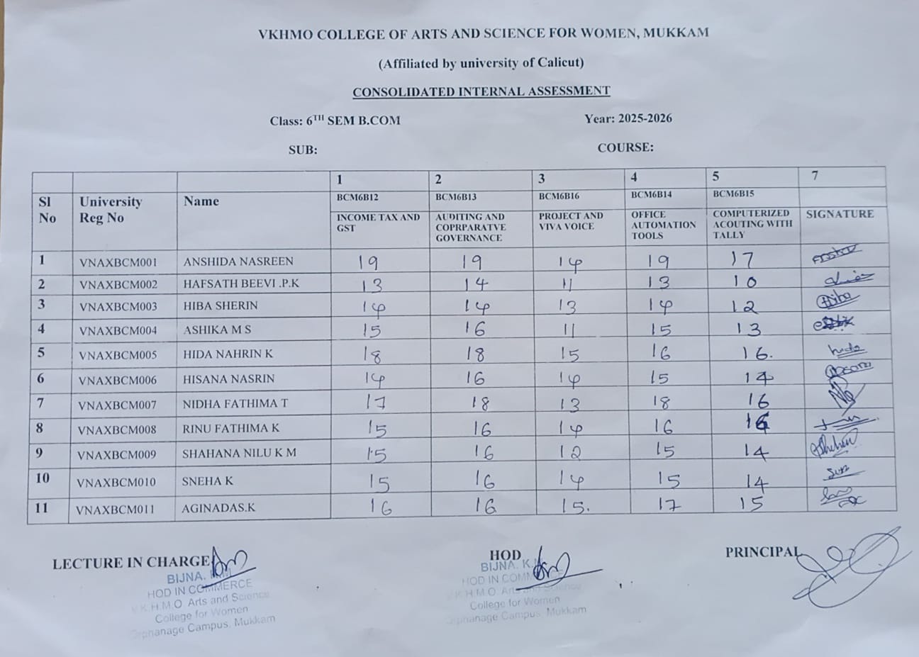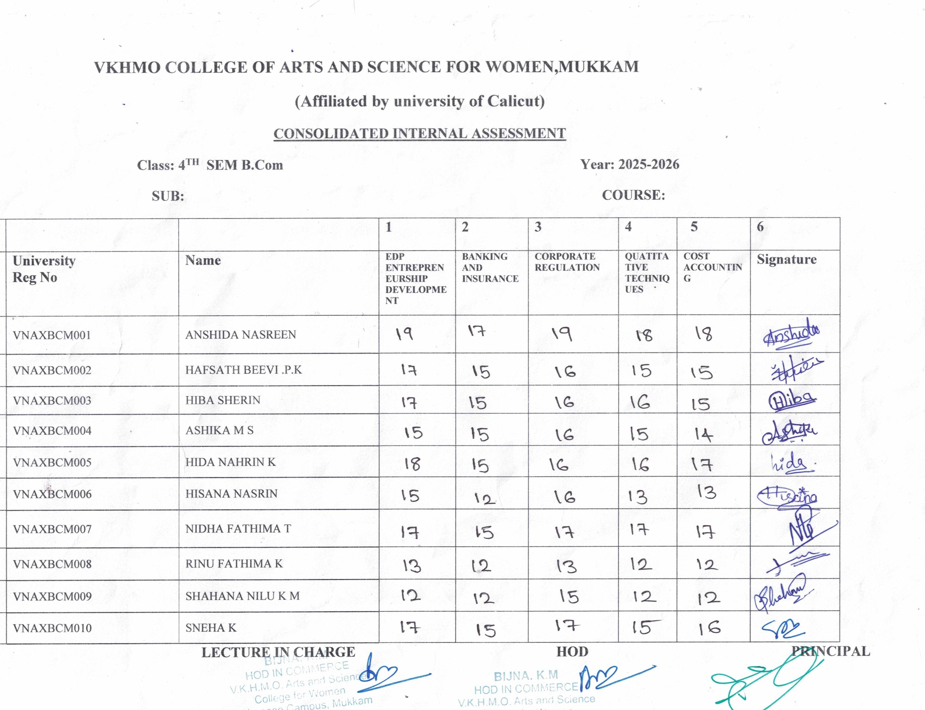 6TH SEM INTERNAL MARK CONSOLIDATED MARK LIST B.COM...